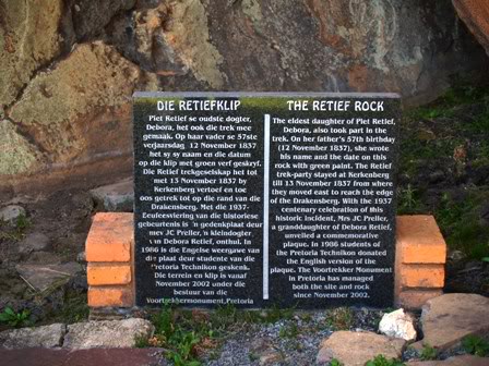 Dieselfde dag nog vertrek die Zoeloes om die niksvermoedende Trekkers by Bloukransrivier, Moordspruit, Malanspruit en Boesmansrivier aan te val; hierdeur word die Trekkers in Natal in die onbeskryflikste ellende gedompel. Tien maande later word die Zoeloemag te Bloedrivier deur Andries Pretorius en sy makkers gebreek (16 Desember.1838). Dingane vlug nadat hy sy stat aan die brand gesteek het. Die oorwinnaars vind die beendere van Retief en sy geselskap op kwaMatiwane, asook Retief se leertas met die grondskenkingsakte nog daarin. Die beendere word in 'n gesamentlike graf geplaas waarop later 'n gedenkteken aangebring is. PIETER MOURIETS (PIET) RETIEF sou dié samebindende leier van die Groot Trek kon geword het, as dit nie was dat die Voortrekkers sulke inherente individualiste was nie. Hoogs bekwaam en geëer, sou die mantel van goewerneur wel dadelik op hom val die oomblik toe hy hom by die ander trekkers aansluit, maar hierdie aanwysing het ongelukkig nie die leierstryd laat verdwyn nie.Hy was ’n sakeman, en waarskynlik ook die geleerdste onder die trekkers. Hy het met 120 weerbare manne en sowat honderd waens gekom, en in dié was ook sy vrou, Magdalena (vroeër die weduwee Greyling), en hul twee seuns en twee dogters. Sy dogters was albei so mooi dat dit aanleiding gegee het tot die naam van sy plaas by Riebeek-Oos—Mooimeisiesfontein. Maar een van die tragedies in sy lewe was dat mislukte sakebedrywighede hom in 1832 vir ’n kort rukkie in die sogenaamde “debtors’ yard” in die Grahamstadse tronk laat beland het. Retief (gebore in die Wamakersvallei, Wellington, op 12 November 1780 en gedood by Dingaanstat, Zoeloeland, op 6 Februarie 1838) was die skrywer van die bekende Retief-manifes. Daarin het hy die redes bekend gemaak waarom die trekkers die Kaapkolonie verlaat. Sowat honderd jaar later sou ’n geleerde nog sê dat die geskiedenis van die hele Suid-Afrika tot op daardie tydstip net kommentaar op die Retief-manifes was. Die verhaal van sy dood is oorbekend: hoe hy van die Zoeloekoning Dingane die belofte gekry het van ’n groot stuk grond, wat alles daartoe gelei het dat hy, sewentig manskappe en ’n groot aantal agterryers doodgemaak is. Daar bestaan, sover bekend, geen outentieke afbeelding van Retief nie. Hy het aan die Oosgrens wel ’n skildery van hom laat maak wat ongelukkig verlore gegaan het. Ons illustrasie is gegrond op die bekende “identikit” wat deur Eric Stockenström saamgestel is, gebaseer op die gesigte van Retief se broer en suster. Uit oorlewering weet ons dat hy ’n man van middelmatige grootte was, effens donker van kleur, met swart hare en baard en ernstige maar vriendelike gelaatstrekke. “Uit alles,” skryf Die Huisgenoot in Desember 1938, “kry ons die indruk dat hy ’n gebore leier was, ’n man met ’n sterk persoonlikheid en groot deursettingsvermoë, maar daarby was hy sagmoedig en vriendelik van aard en ’n man van innerlike godsvrug. Die verslaendheid en gevoel van hulpeloosheid wat sy heengaan onder die trekkers veroorsaak het, was meteens die maatstaf van sy grootheid.” Daar is twee verklarings vir die oorsprong van die naam van Pietermaritzburg, die hoofstad van die provinsie KwaZulu-Natal. Die bekende verklaring is dat dit genoem is na Piet(er) Retief sowel as Gerrit Maritz. Volgens ’n tweede verklaring is Piet Retief egter alleen vernoem en is sy voorname—te wete Pieter Mouriets—opgeneem in “Pieter Mouriets Burg”, wat later as Pietermaritzburg herinterpreteer sou word. Die dorp Piet Retief in die provinsie Mpumalanga dra ook Piet Retief se naam. PIET RETIEF SE TRAKTAAT