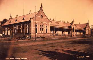 The Staats Model School is situated on the corner of Van der Walt (nou Lilian Ngoyi) and Skinner (nou Nana Sita) Streets in Pretoria, Transvaal, Republic of South Africa. It originated from a school established in 1893 to train teachers in the Zuid Afrikaansche Republik, or ZAR. Sytze Wierda, chief architect of the ZAR, designed the building in 1895, and the construction was completed by Te Groen in 1896. The structure consists of brick and Stinkwater sandstone and adheres to the Neo Dutch Renaissance school of architecture. On 11 October 1899 the school closed its doors as a result of the outbreak of the Anglo-Boer War. During the war British officers were held captive in this building and the escape of Winston Churchill, war correspondent and later British prime minister, from there has become legend. The school regained some life from 1902 to 1909 as the Pretoria College for Boys, which later became Pretoria Boys High School. In 1910 the college moved to larger premises and the Staats Model School building housed several other schools after that. The Library Services of the Transvaal Education Department, or TED, moved in during 1951. The building was declared a national monument on the 8th of April 1960. (teks erkenning aan: en.wikipedia.org. Text is available under the Creative Commons Attribution-ShareAlike License;